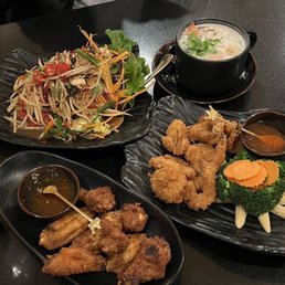 Excellent food. It gets packed and is incredibly popular. Expect to wait if you arrive during peak hours. Theres parking at the side and back of restaurant. The staff is friendly. The food was delicious. We ordered the popcorn lobster, hangover with shrimp, frenzy asparagus, wonton soup, and for dessert the mango sticky rice. The soup part of the wonton soup, for some reason I didn't like it but my husband did. It didn't have like a brothy taste it had a hint of sweetness, they added chicken, and didn't have a lot of vegetables. The other food was hands down so good. The other two entrees you can choose what protein you want or you can leave it out if you want all vegetables/ vegetarian. It's really pretty inside.
